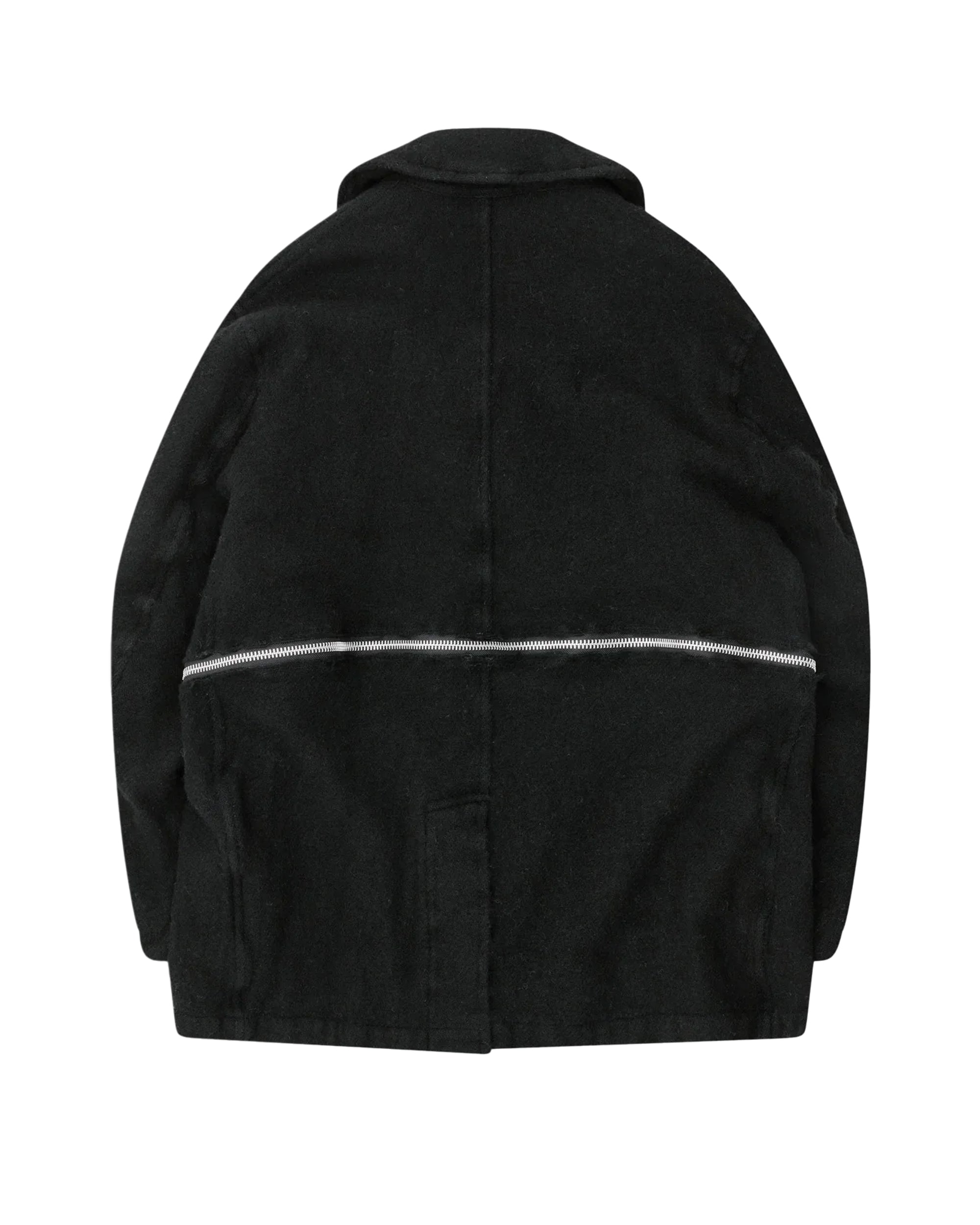 Zweireihiger Pea Coat aus gekochter Wolle mit durchgehendem, umlaufendem Reißverschluss zum Abnehmen des unteren Teils des Kleidungsstücks.