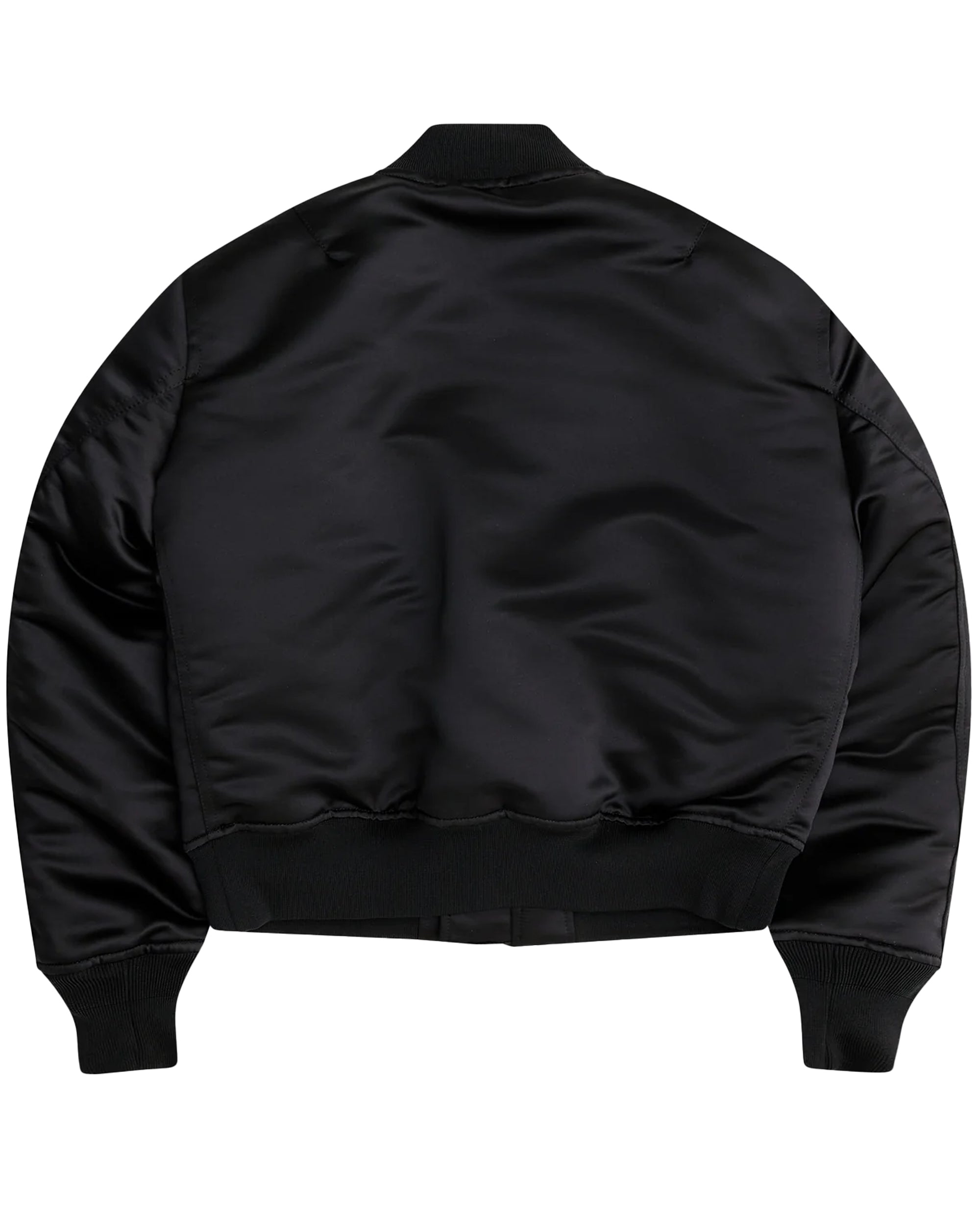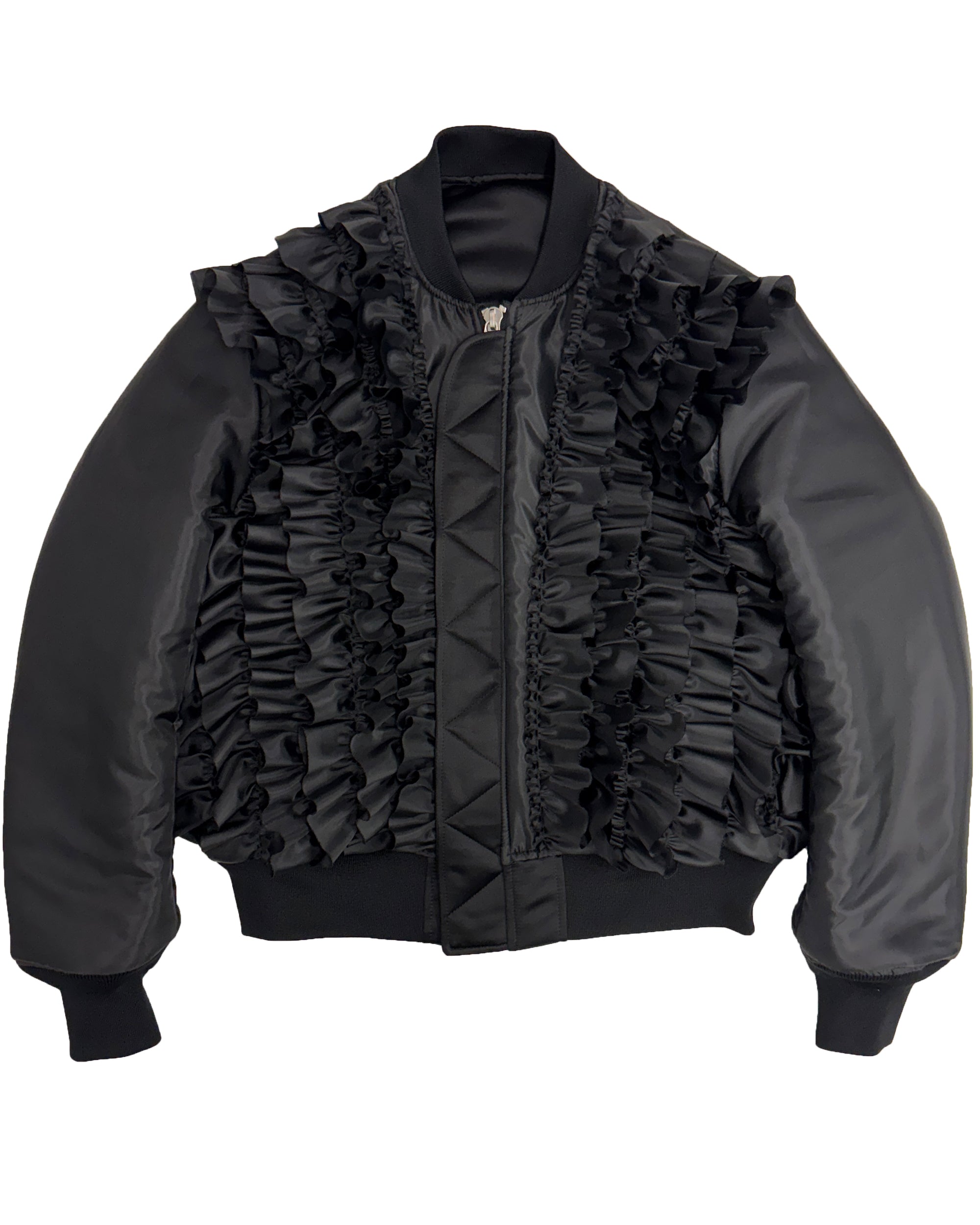 Eine wendbare Bomberjacke mit Rüschenfutter, das nach außen gedreht werden kann.