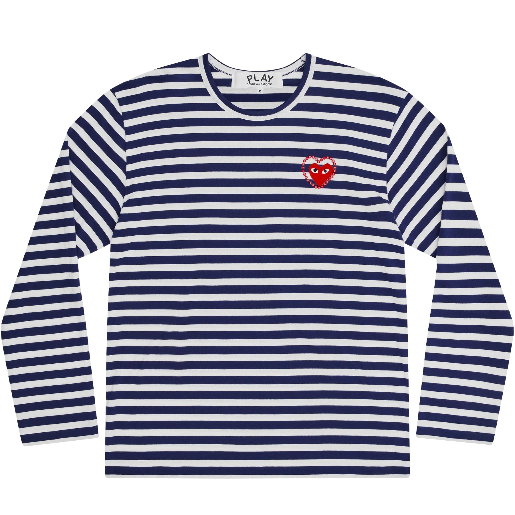 Play Comme des Garçons Langarm-T-shirt - Blau-Weiß Streifen / Rotes Strassstein Herz