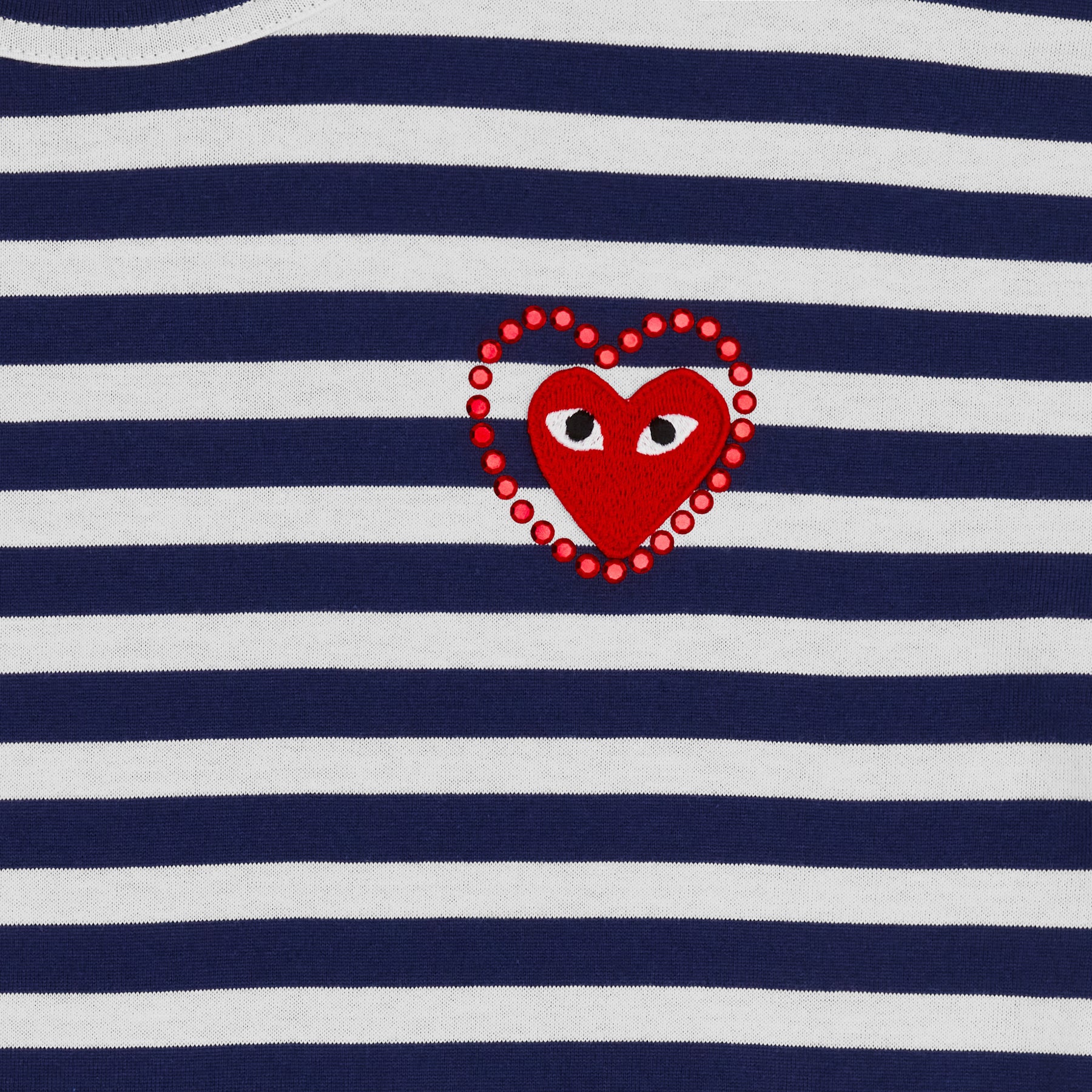 Dieses gestreifte Langarm T-Shirt ist mit der charakteristischen roten Herzstickerei von Comme des Garçons PLAY umrandet von Metallstrass versehen.