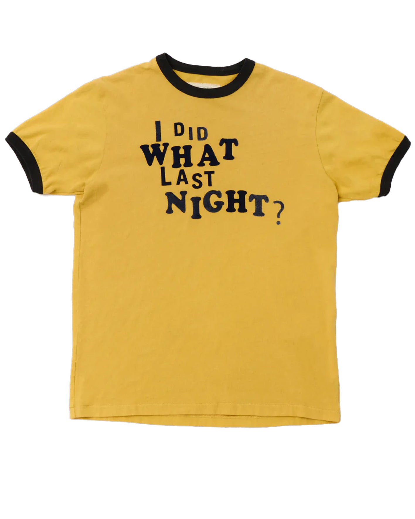 Ringer-T-Shirt in sonnengebleichtem Gelb mit marineblauem Paspeln in leichter Baumwolle mit „I DID WHAT LAST NIGHT?“-Flockdruck.