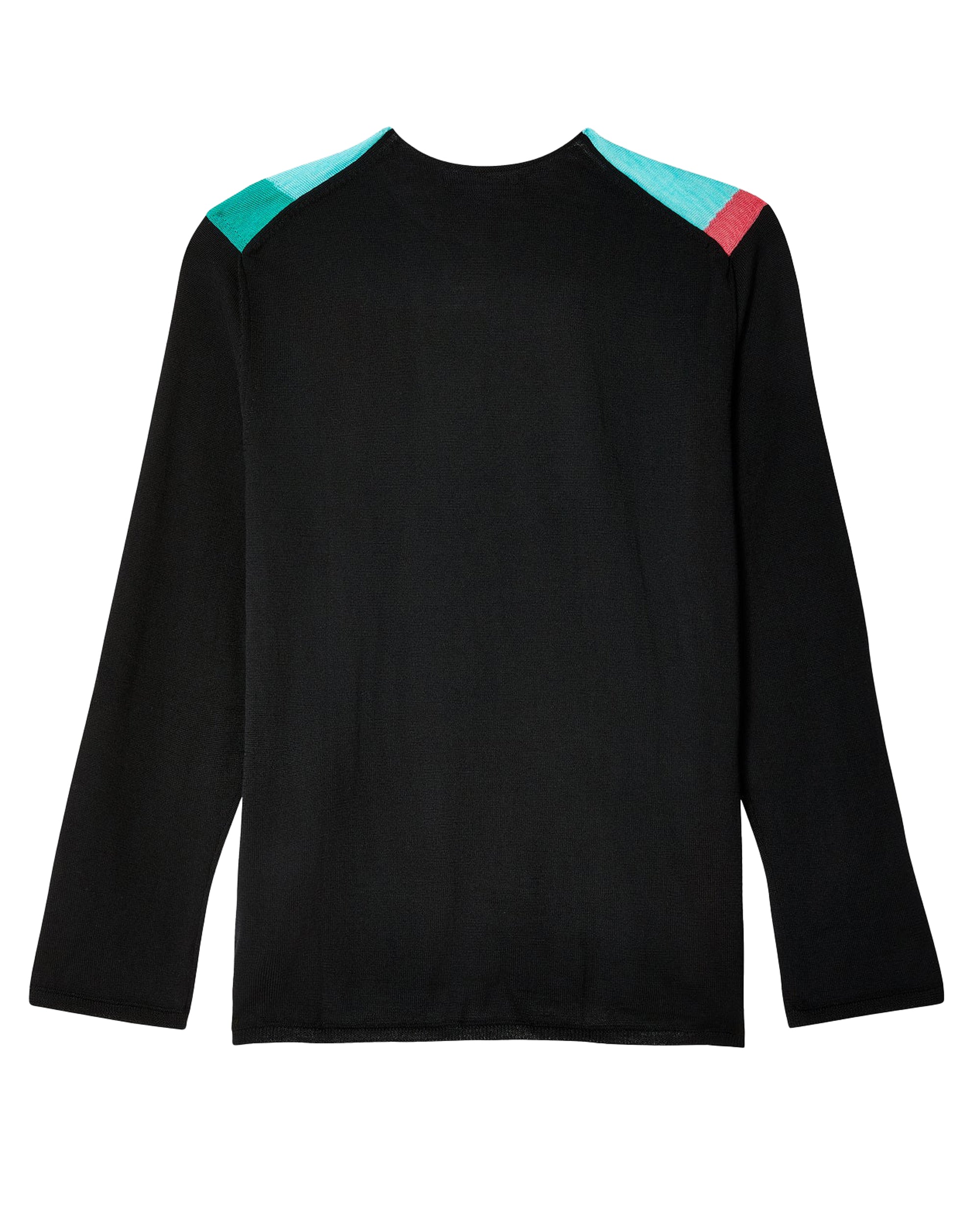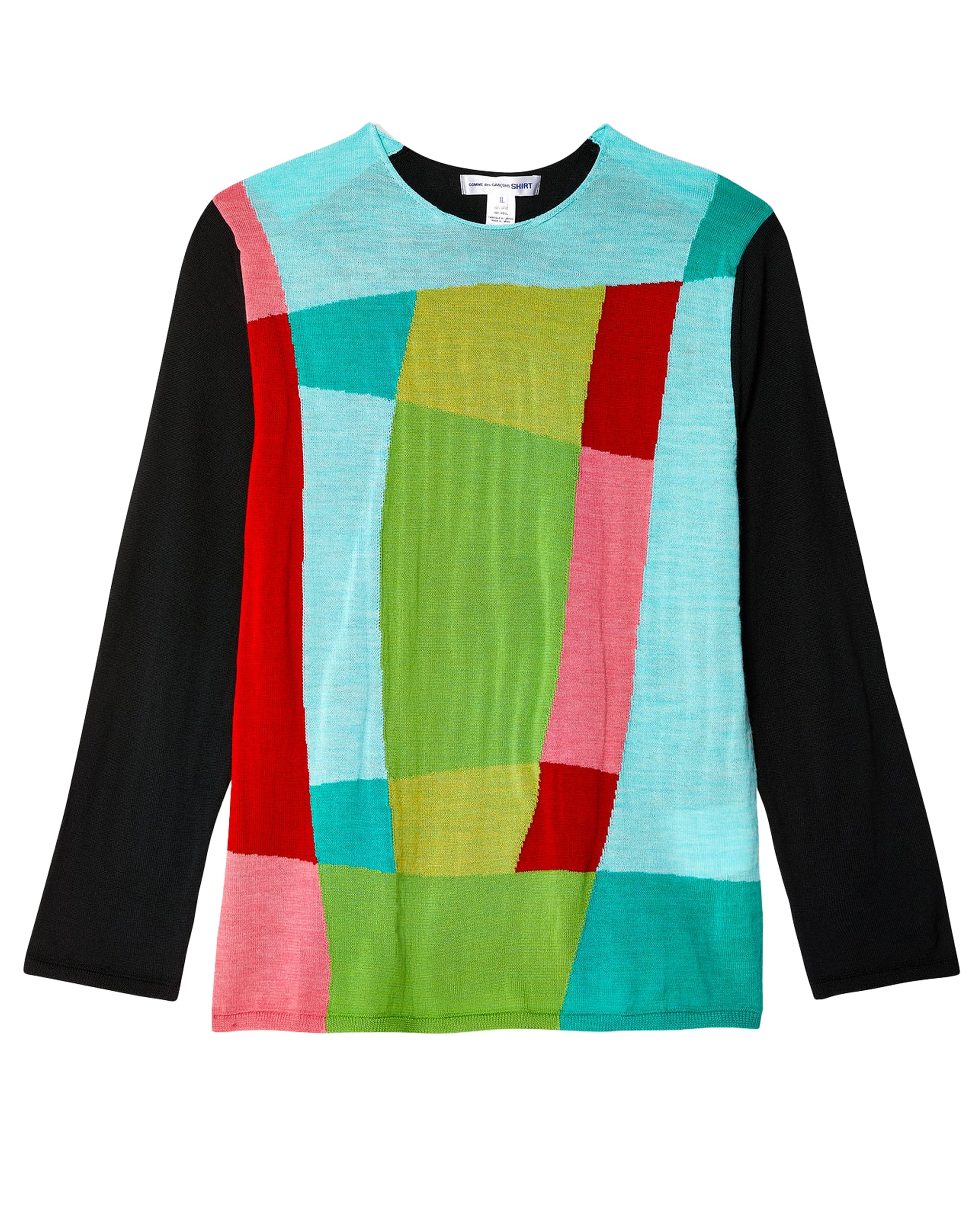 Locker sitzender, gerade geschnittener, langärmeliger Strickpullover mit einem Vorderteil aus mehrfarbigem Patchwork.