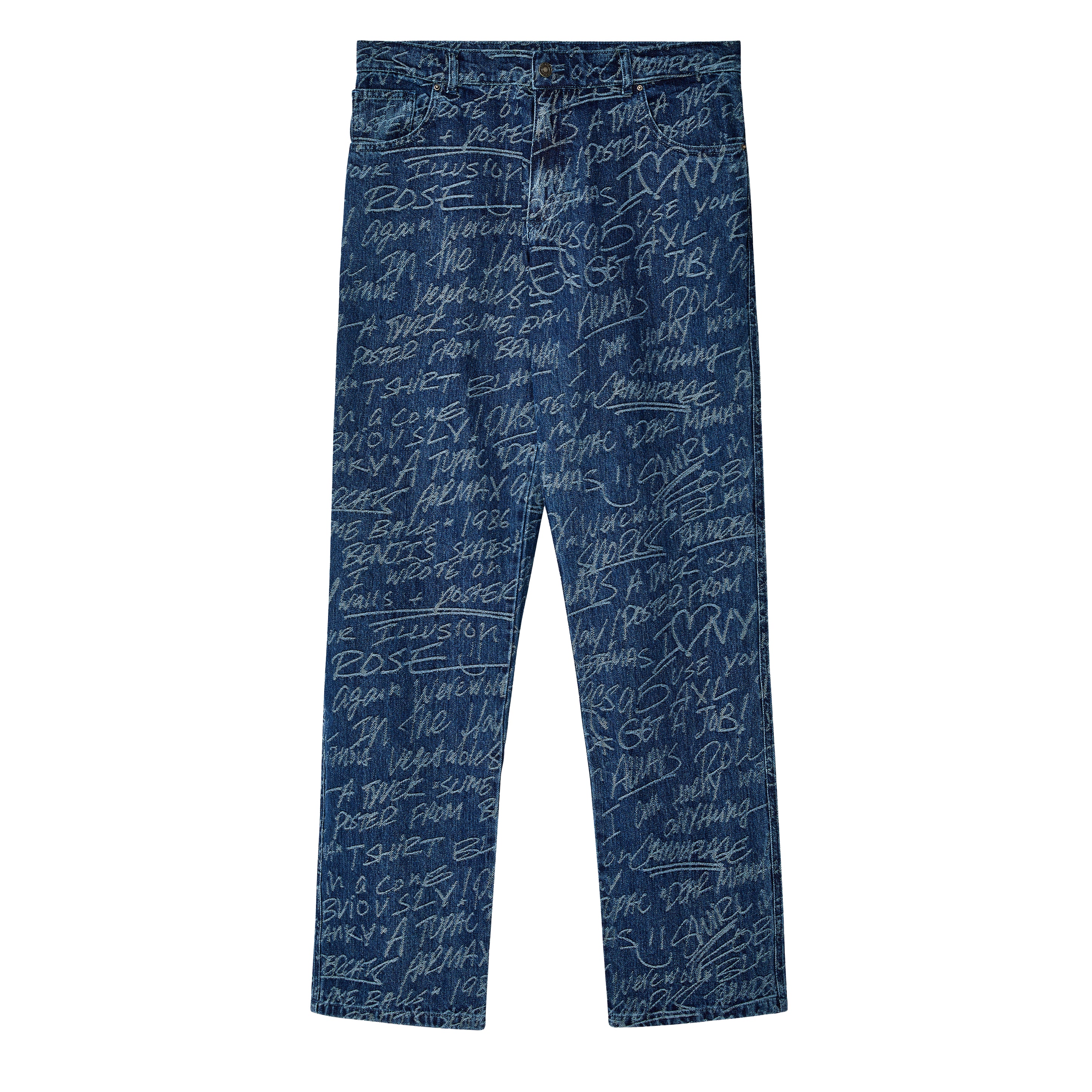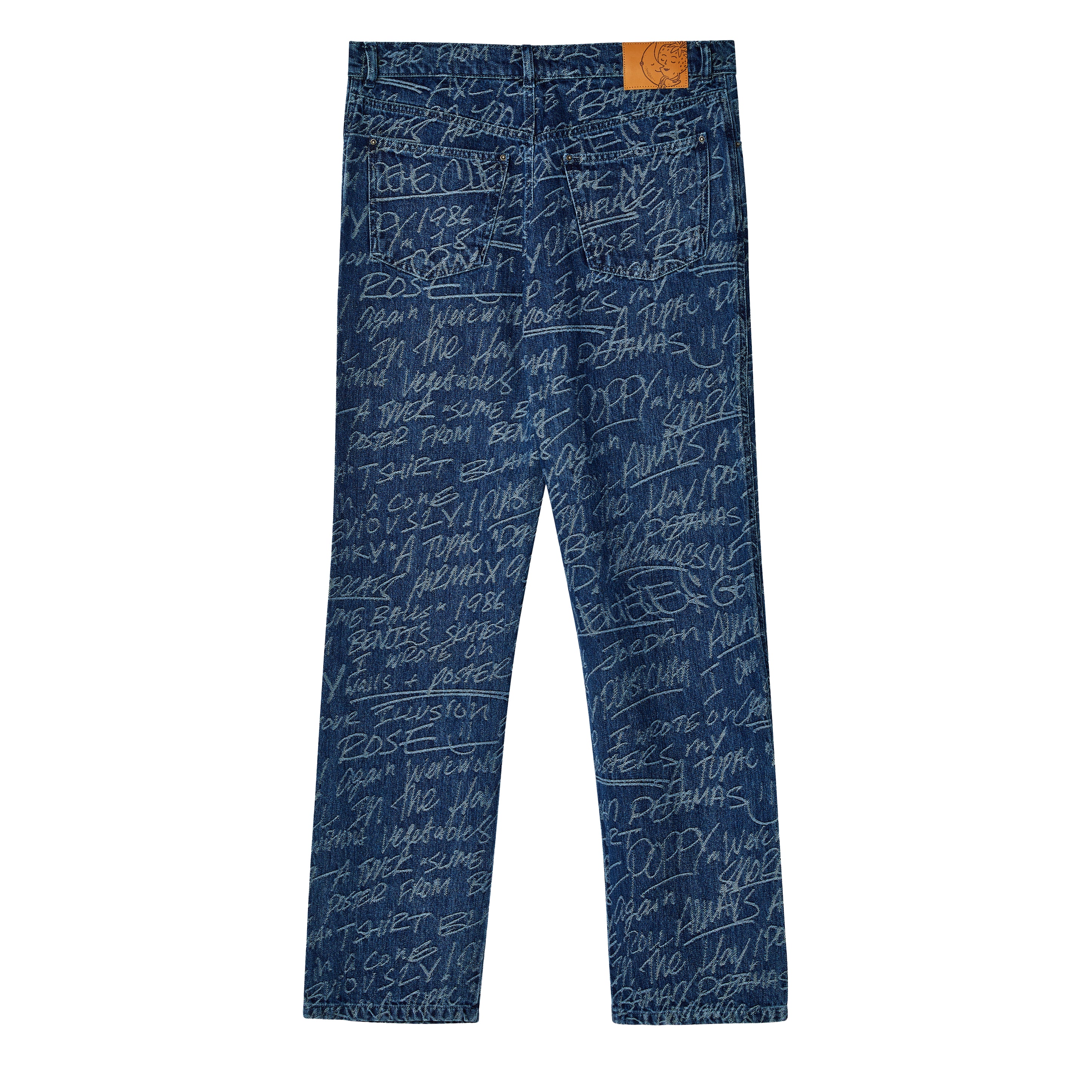 Jacquard-gemusterter Denim mit einer Kreation von Ben Solomon, Designer und Künstler der legendären IRAK-Crew. Die scheinbar zufälligen Wörter und Sätze stammen aus einem biografischen Fragebogen, den Sky High Farm ihre Freunde ausfüllen ließ, um sich für die Kollektion inspirieren zu lassen.