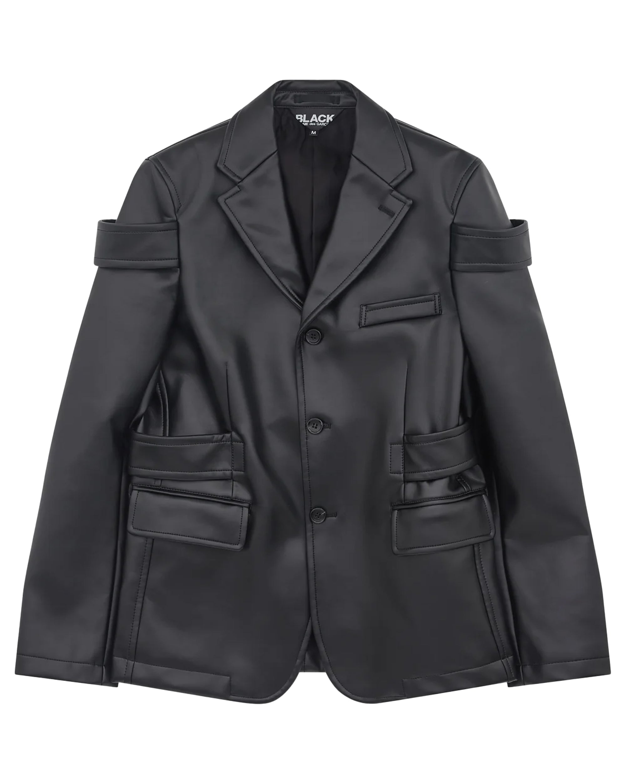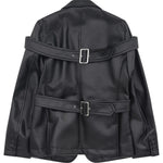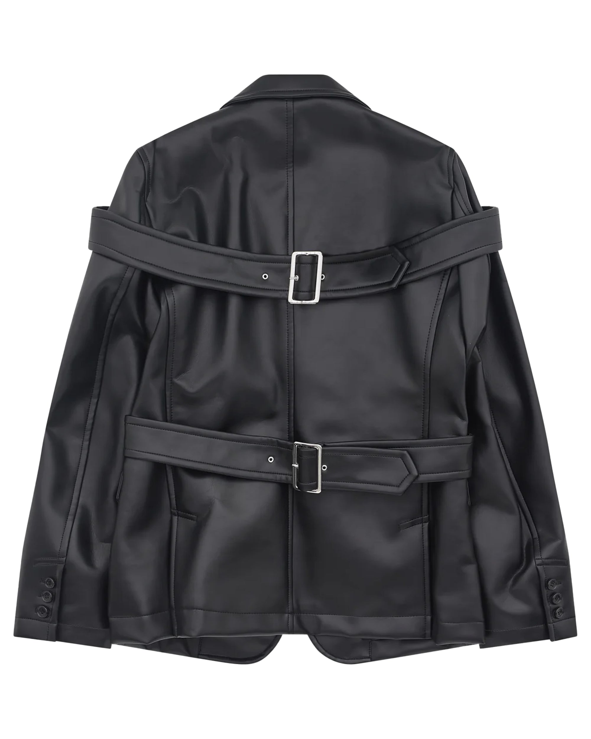 Kunstlederblazer mit klassischem Reverskragen, Knopfleiste vorne und doppelter Schnalle hinten.