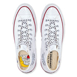 Der CONVERSE x Sky High Farm Workwear Chuck 70 besteht aus weißem Canvas mit einem Strawberry-Moon-Logo und einem individuellen Sternenaufnäher mit dem Motto der Marke: FEED YOUR NEIGHBOR, LOVE YOUR NEIGHBOR“, einer Einlegesohle mit Co-Branding, Schnürsenkeln mit Sternendruck und einem einzigartigen Sternenmotiv auf dem Fersenlabel des linken Schuhs.