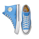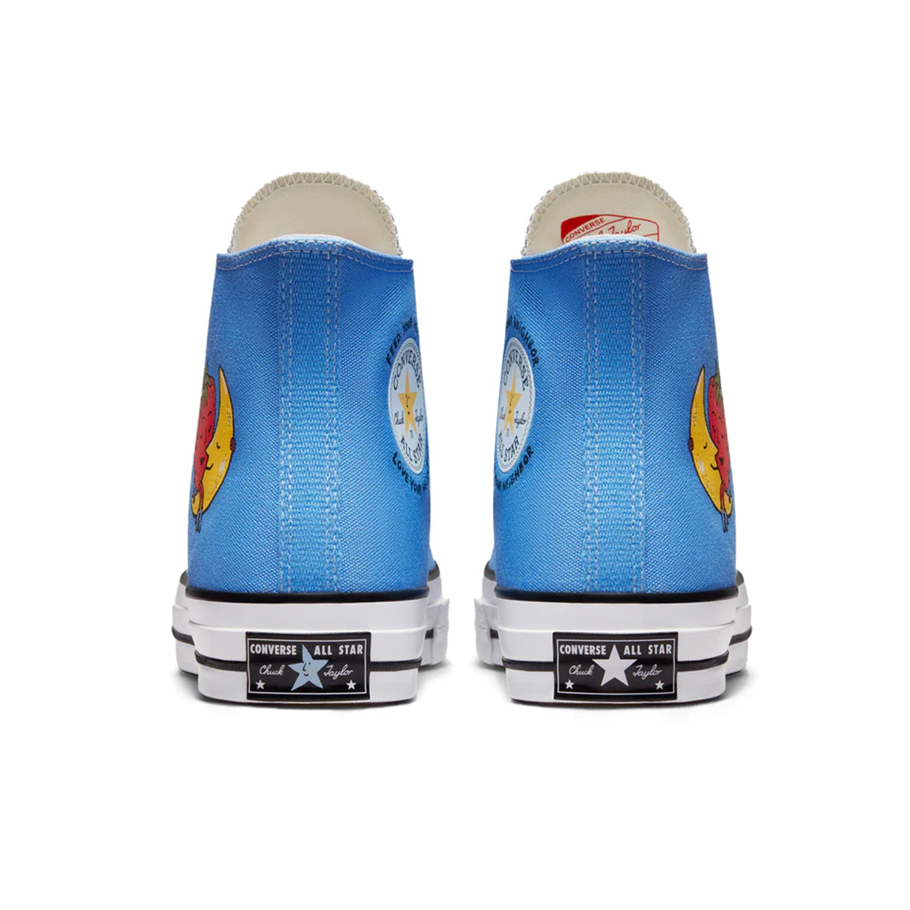 Der CONVERSE x Sky High Farm Workwear Chuck 70 besteht aus hellblauem Canvas mit einem Strawberry-Moon-Logo und einem individuellen Sternenaufnäher mit dem Motto der Marke: FEED YOUR NEIGHBOR, LOVE YOUR NEIGHBOR“, einer Einlegesohle mit Co-Branding, Schnürsenkeln mit Sternendruck und einem einzigartigen Sternenmotiv auf dem Fersenlabel des linken Schuhs.