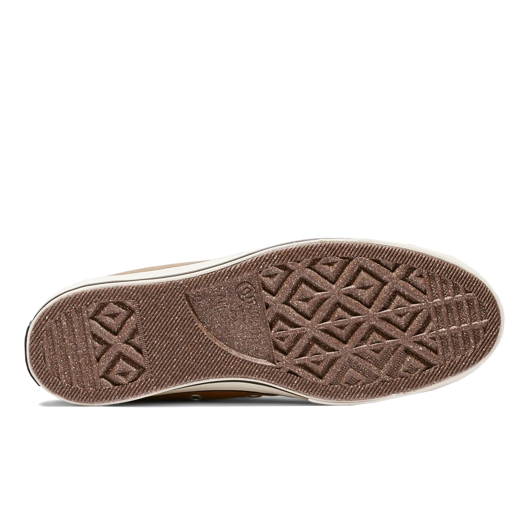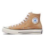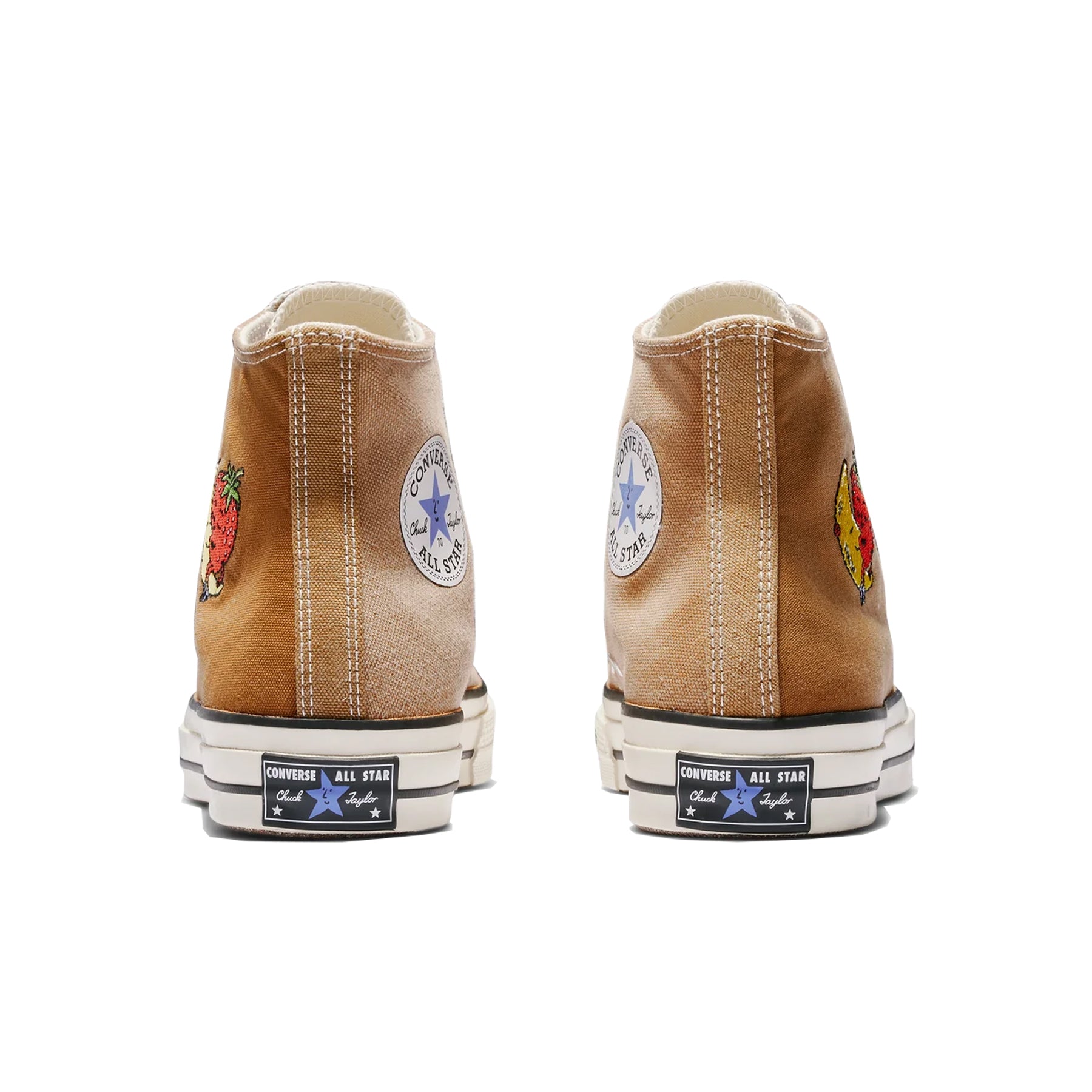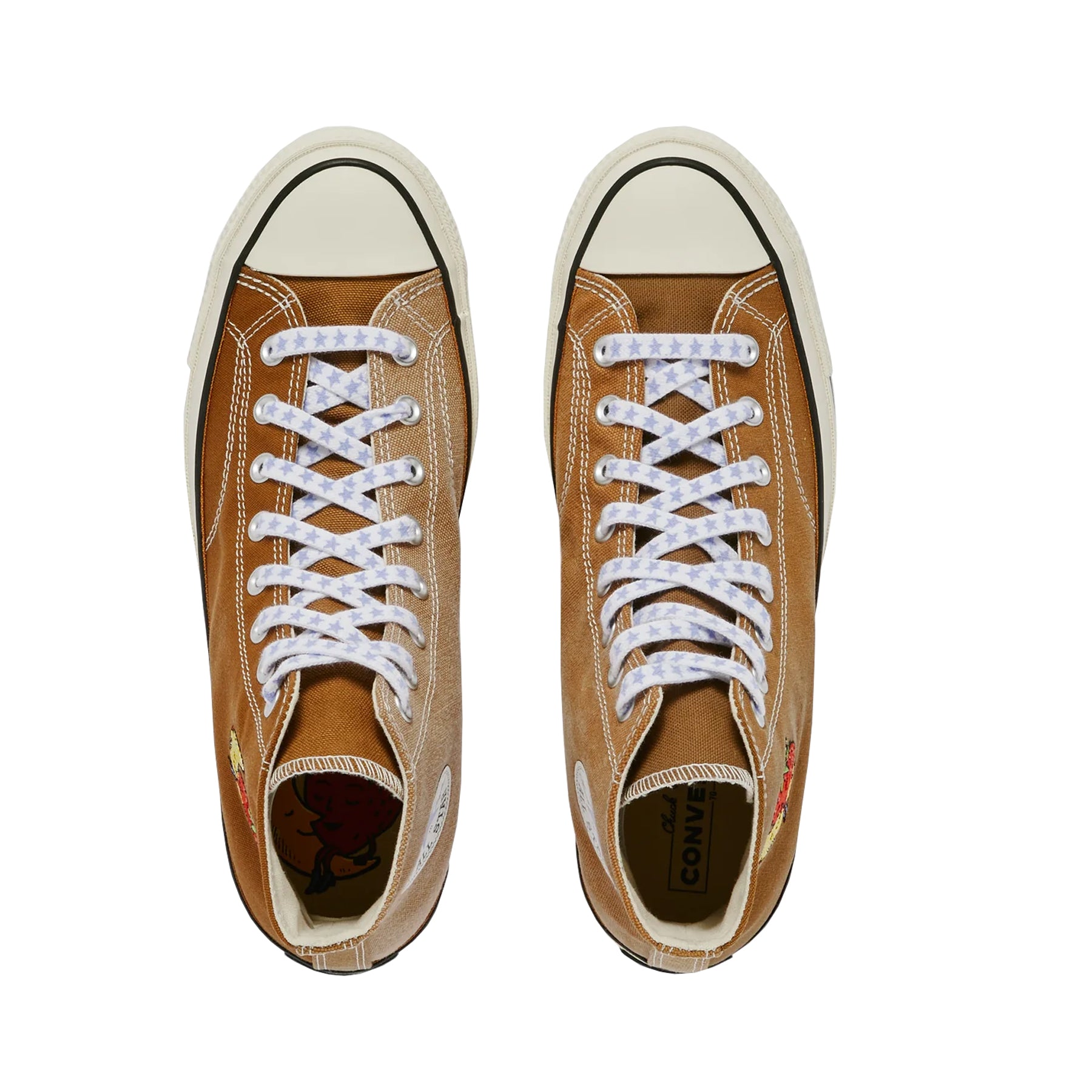 Der CONVERSE x Sky High Farm Workwear Chuck 70 besteht aus naturbraunem Canvas mit einem Strawberry-Moon-Logo und einem individuellen Sternenaufnäher mit dem Motto der Marke: FEED YOUR NEIGHBOR, LOVE YOUR NEIGHBOR“, einer Einlegesohle mit Co-Branding, Schnürsenkeln mit Sternendruck und einem einzigartigen Sternenmotiv auf dem Fersenlabel des linken Schuhs.