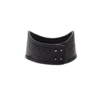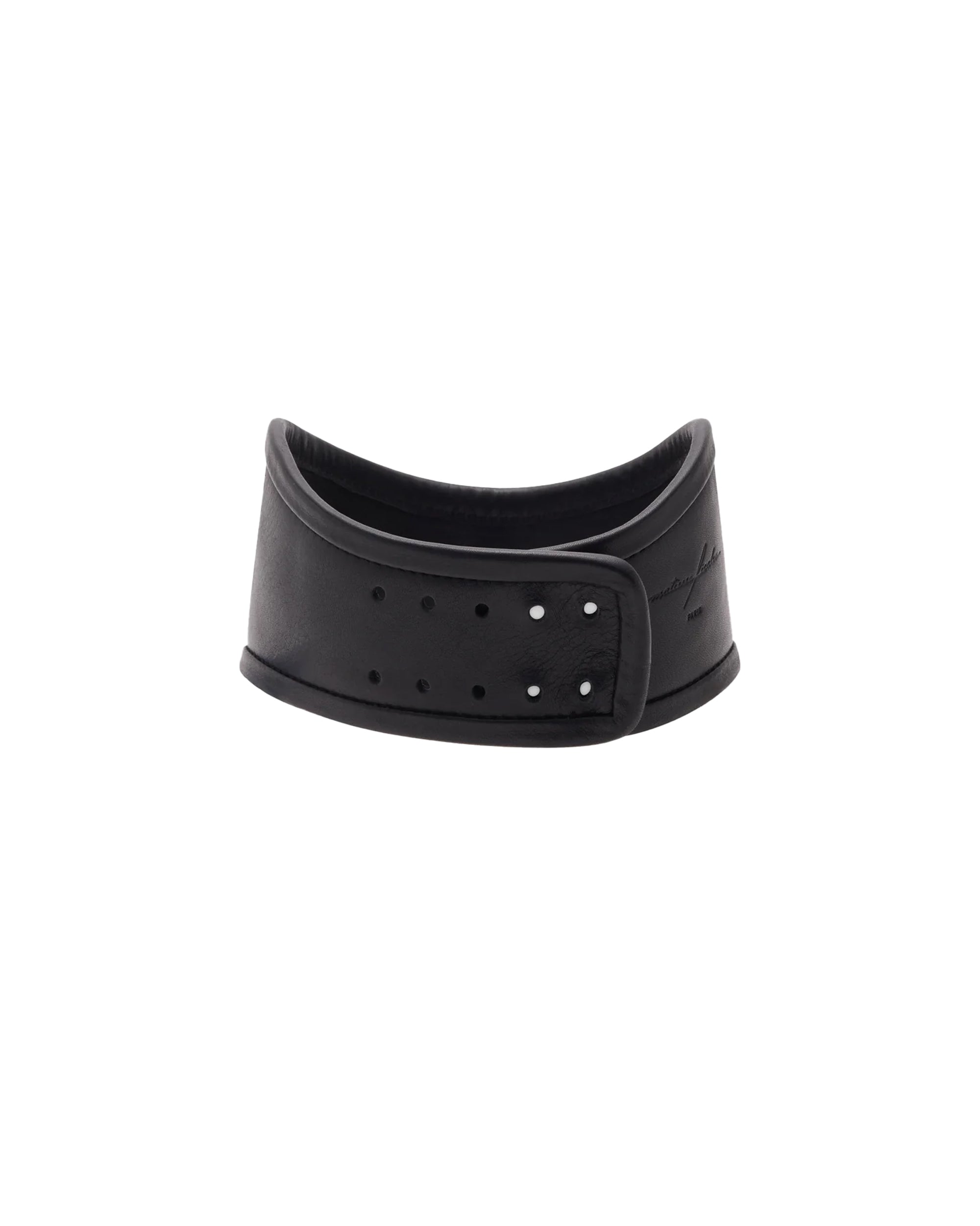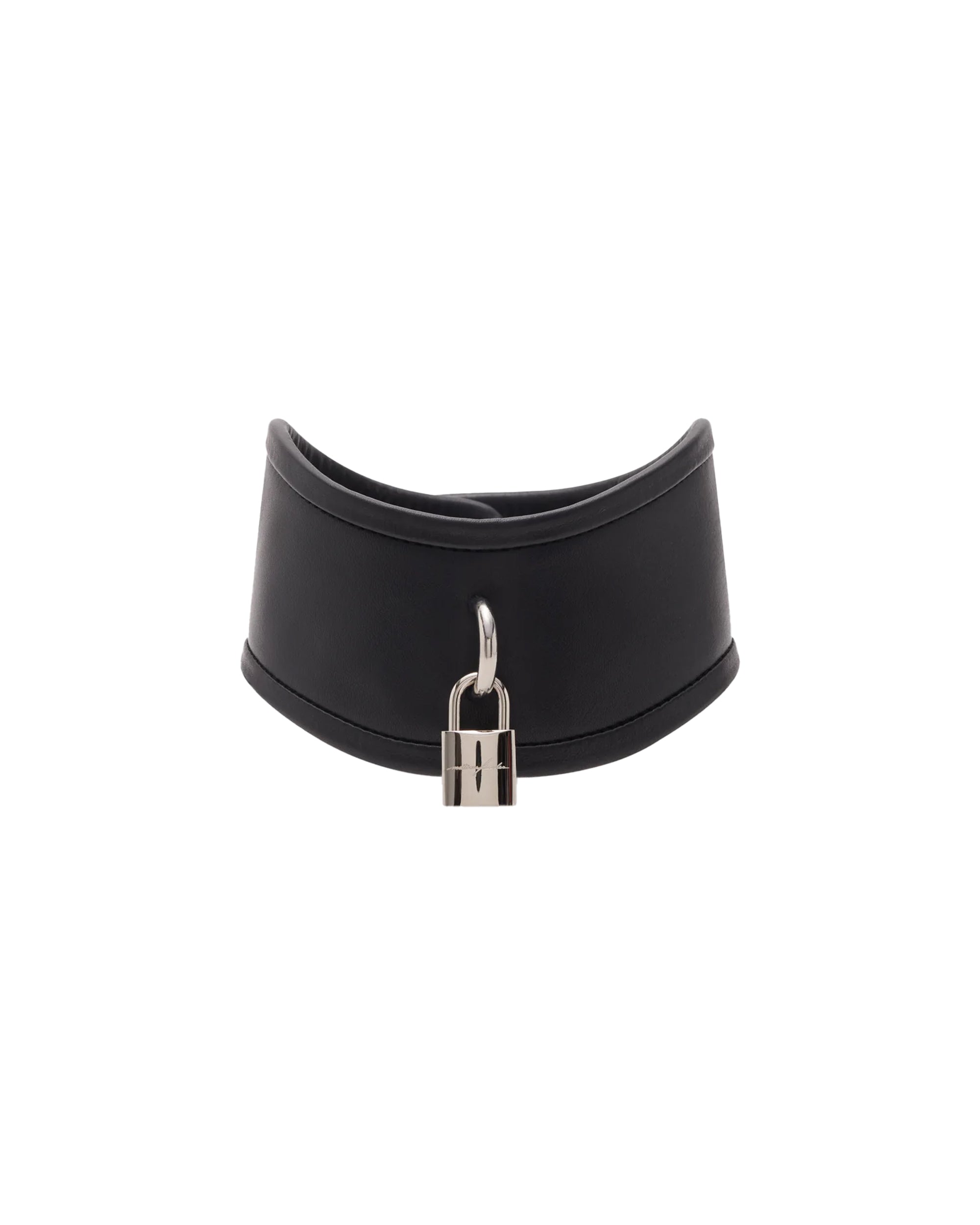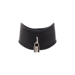 This choker necklace, inspired by fetish fashion, is adjustable, features a padlock pendant on the front, and has the Matieres Fecales logo embossed into the leather.