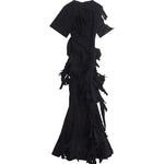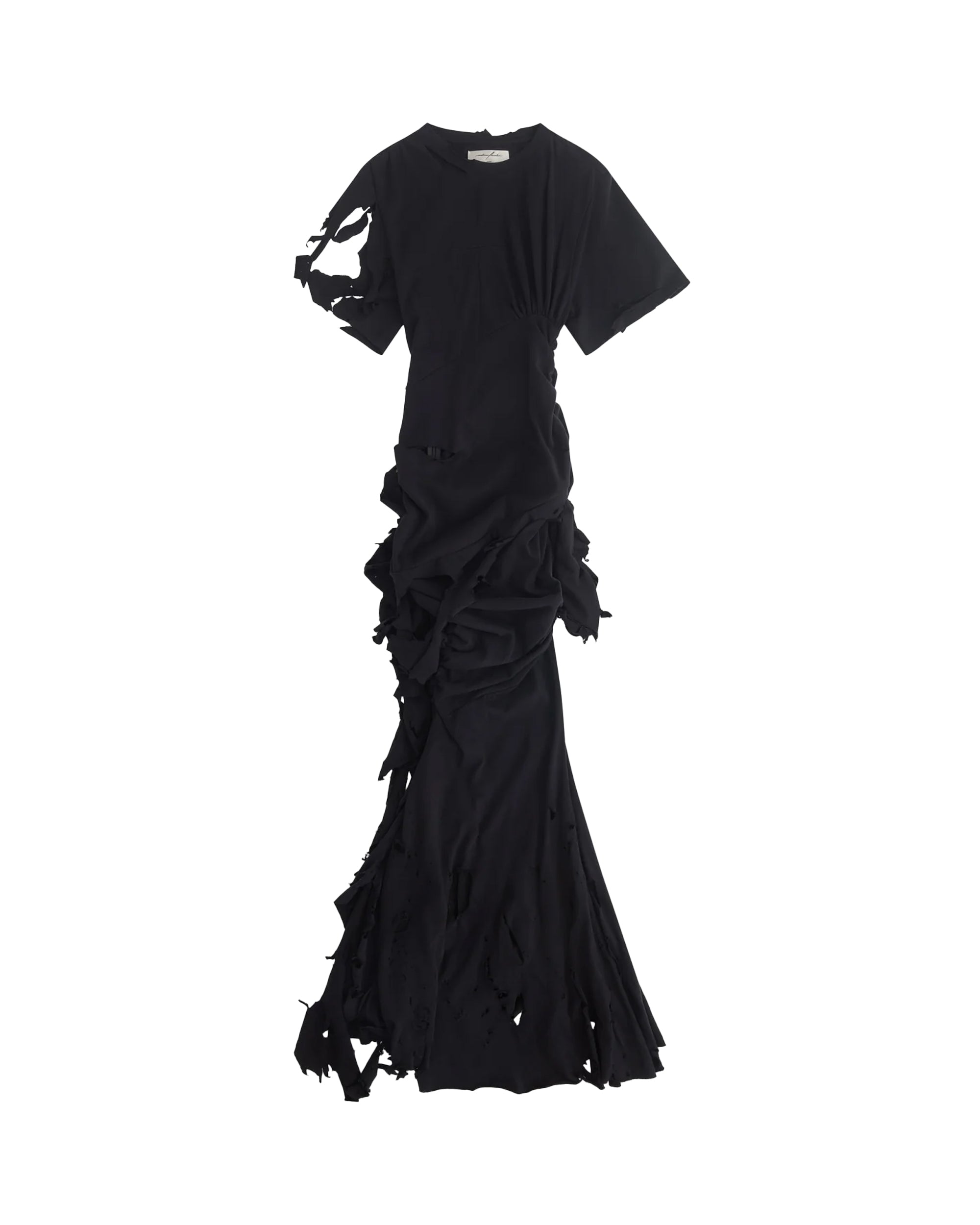 Black cotton knit maxi dress with distressed finishing. Designed with slashed short sleeves, an open back, and asymmetric draping with ruffled accents for a fluid silhouette.