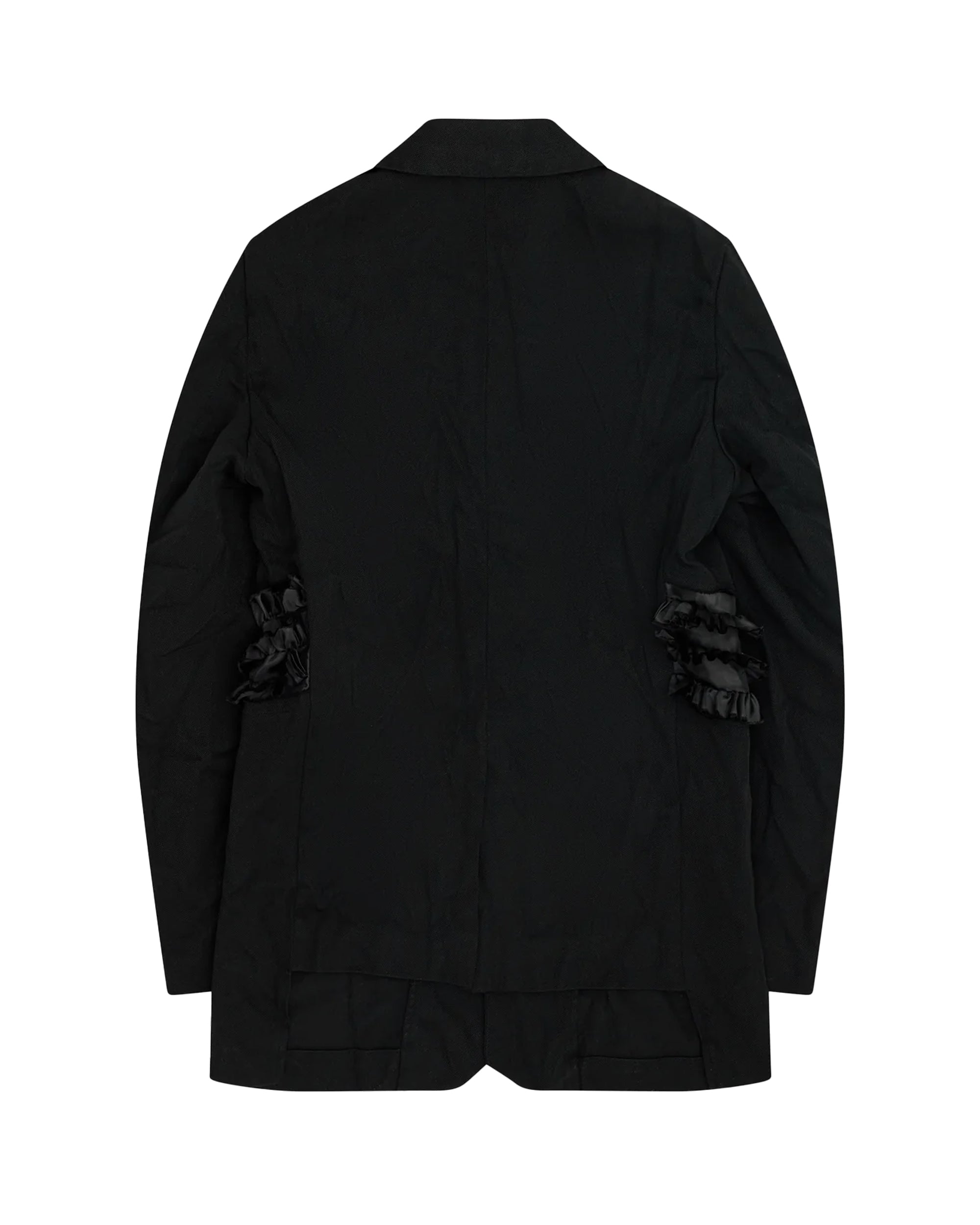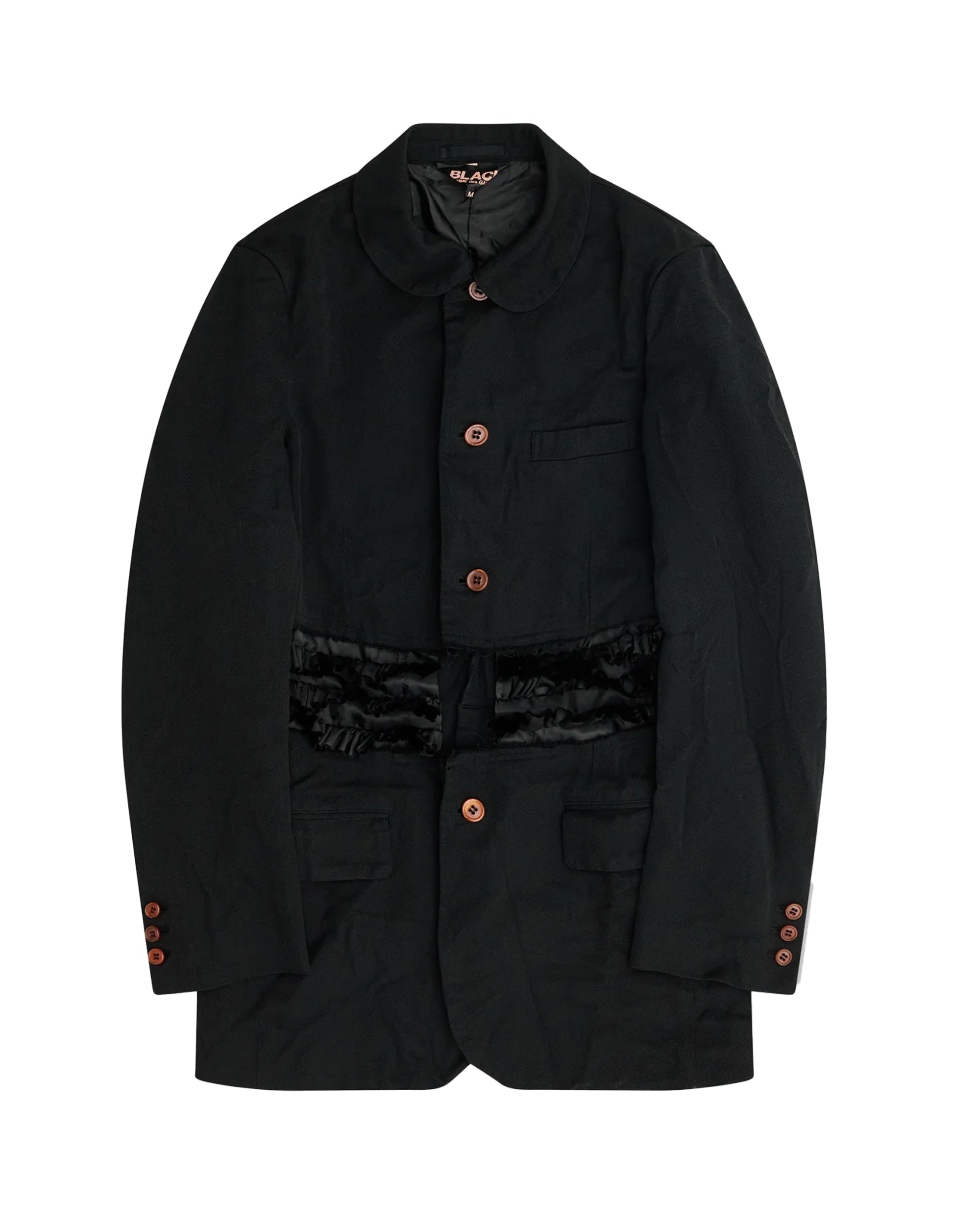 Lange einreihige Jacke mit Ausschnitt in der vorderen Mitte und kontrastierendem Rüschendetail.