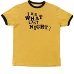 Ringer-T-Shirt in sonnengebleichtem Gelb mit marineblauem Paspeln in leichter Baumwolle mit „I DID WHAT LAST NIGHT?“-Flockdruck.